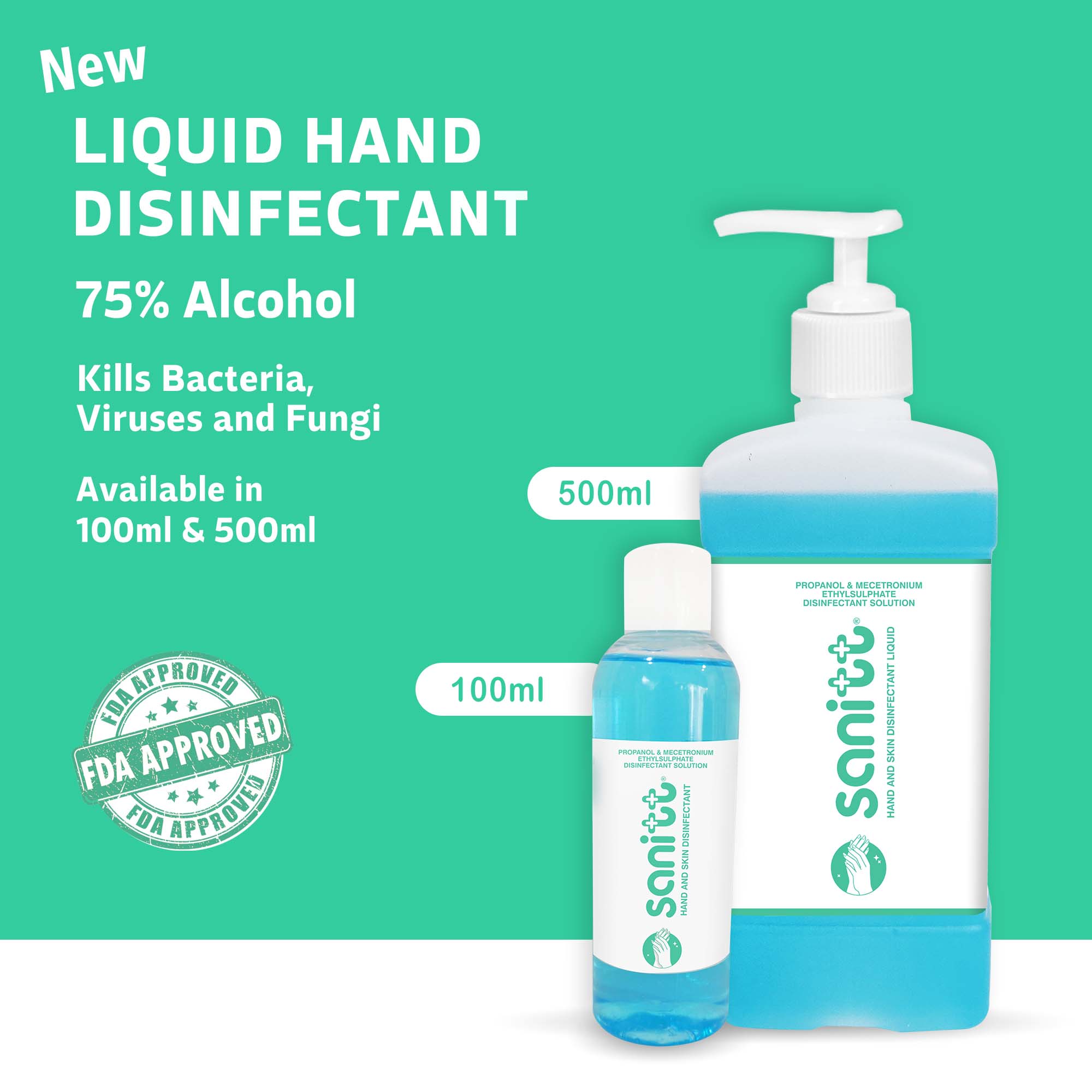 • Sanitt liquid hand sanitizer is an FDA approved formulation with Mecetronium Ethyl Sulphate and 75% alcohol